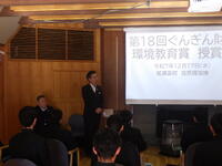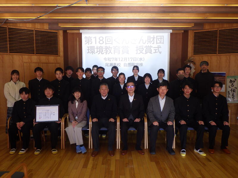 12月17日(水)、本校の自然環境棟ミーティングルーム1にて授賞式を行いました。連携型中高一貫教育に係る地元中学校との自然観察会、自然環境科3年生が主導する形で吹割の滝を案内する利根小学校との交流会や片品小学校との交流会、総合的な探究の時間における体験型自然観察会など、本校の地域と連携した取組が第18回ぐんぎん財団環境教育賞の最優秀賞として表彰されました。今回の受賞にあたっては、日本一を狙える内容であるとのお墨付きをいただきました。大変ありがたいことです。生徒の皆さんには、在学中も卒業後も環境活動に携わるスペシャリストとしての活躍を期待しています。