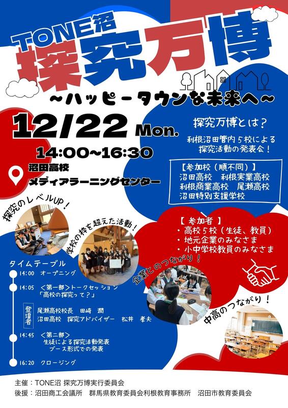 12月22日(月)に、利根沼田地域の学校5校(沼田高校、利根実業高校、利根商業高校、沼田特別支援学校、尾瀬高校)が集結した探究イベントが新・沼田高校のメディアラーニングセンターで開催されます!